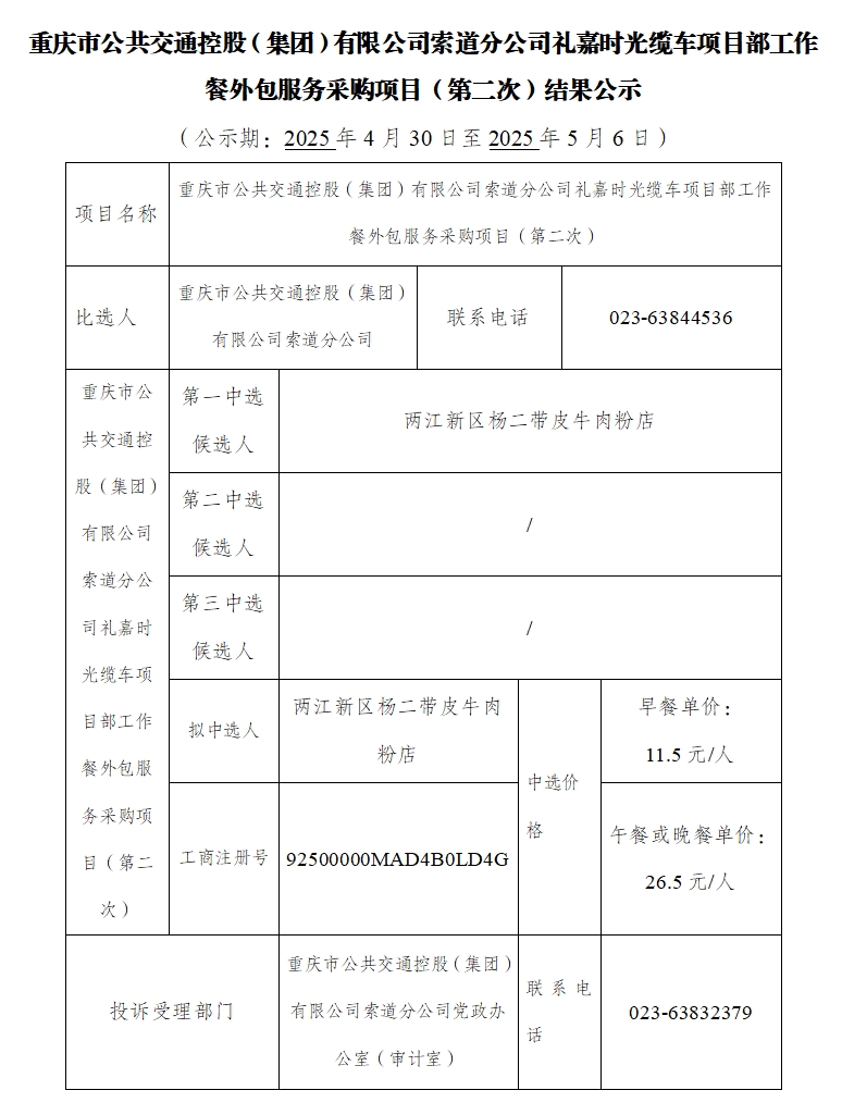 重慶市公共交通控股(集團)有限公司索道分公司禮嘉時光纜車項目部工作餐外包服務采購項目(第二次)結(jié)果公示