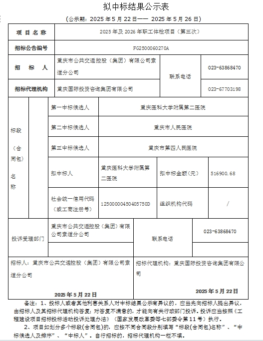2025年及2026年職工體檢項(xiàng)目(第三次)擬中標(biāo)結(jié)果公示表