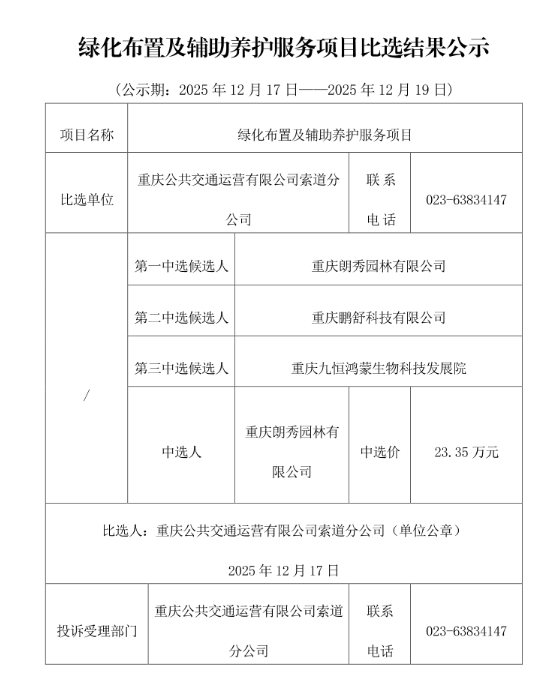 重慶公共交通運(yùn)營(yíng)有限公司索道分公司綠化布置及輔助養(yǎng)護(hù)服務(wù)項(xiàng)目比選結(jié)果公示