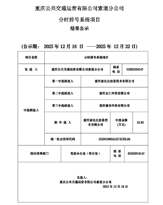 重慶公共交通運(yùn)營(yíng)有限公司索道分公司分時(shí)排號(hào)系統(tǒng)項(xiàng)目結(jié)果公示