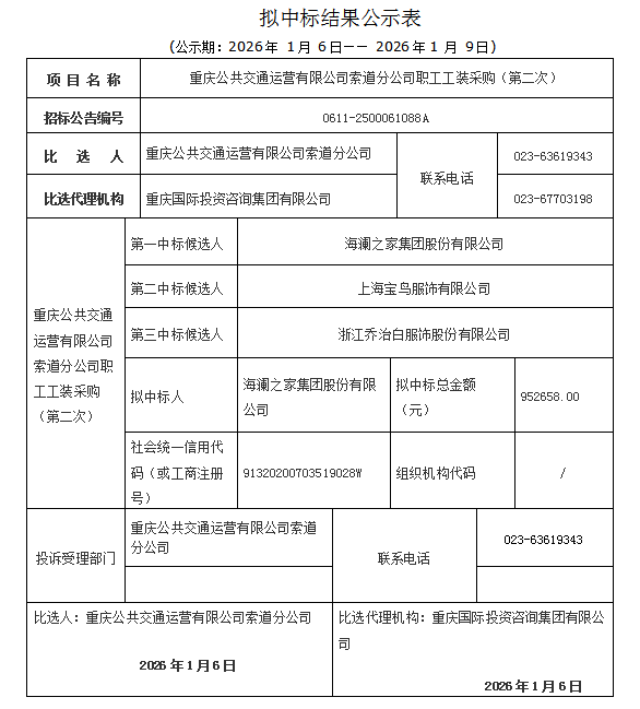 重慶公共交通運(yùn)營(yíng)有限公司索道分公司職工工裝采購(gòu)(第二次)擬中標(biāo)結(jié)果公示