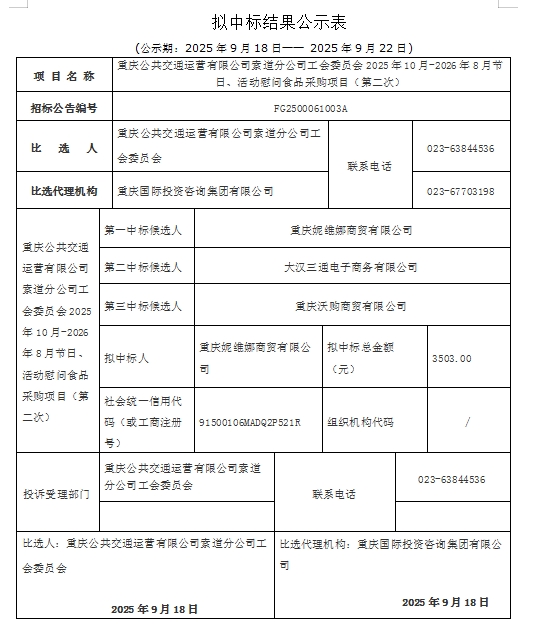 重慶公共交通運營有限公司索道分公司工會委員會2025年10月-2026年8月節(jié)日、活動慰問食品采購項目(第二次)結(jié)果公示